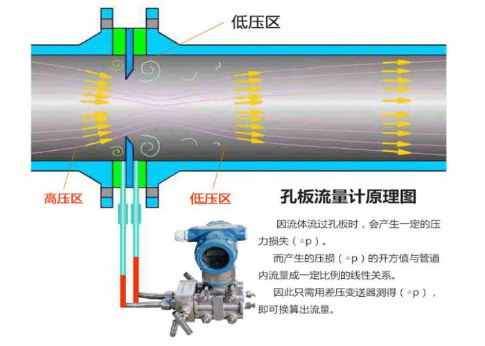 當流體經(jīng)管道內(nèi)的節(jié)流裝置時,流速將在節(jié)流裝置的節(jié)流件處形成局部收縮,從而使流速增加,靜壓力低,于是在節(jié)流件前后便產(chǎn)生了壓力降,即壓差,介質(zhì)流動的流量越大,在節(jié)流件前后產(chǎn)生的壓差就越大,所以孔板流量計可以通過測量壓差來衡量流體流量的大小。這種測量方法是以能量守衡定律和流動連續(xù)性定律為基準的。