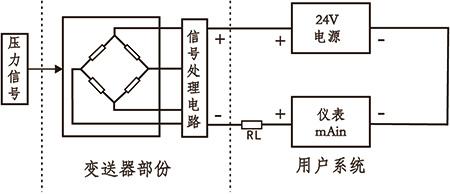 變送器由傳感器和信號(hào)處理電路組成,其中傳感器感壓面設(shè)有惠斯通電橋,當(dāng)壓力增加時(shí),電橋各橋臂電阻值發(fā)生變化,通過信號(hào)處理電路,轉(zhuǎn)換成電壓信號(hào)輸出,最終通過放大電路將其轉(zhuǎn)換成標(biāo)準(zhǔn)(4~20mA)DC信號(hào)輸出,