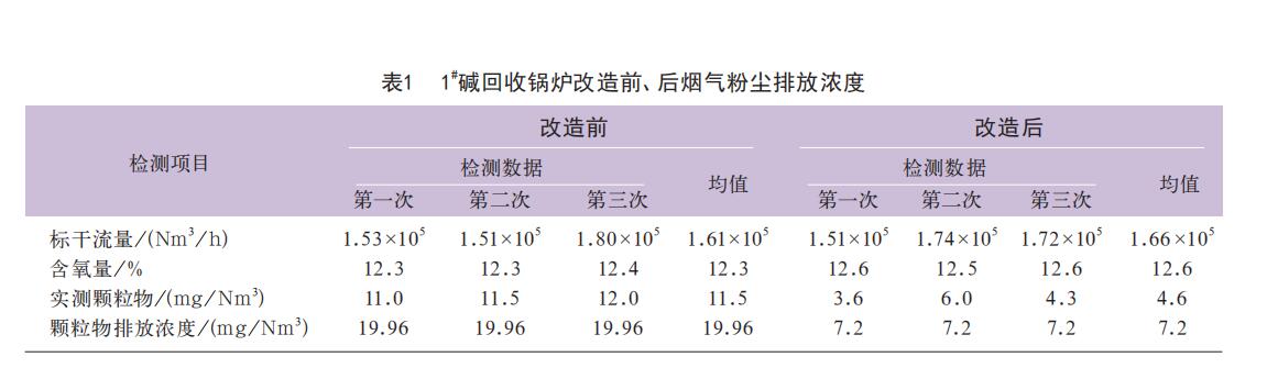 (2)煙氣中的堿灰溶于循環(huán)水回送溶解槽,回收利用其中堿成分。經(jīng)測(cè)算,回收堿灰2.0 4k g/h,回收堿(以Na2CO3計(jì))0.92kg/h,堿回收率提高了0.016%。